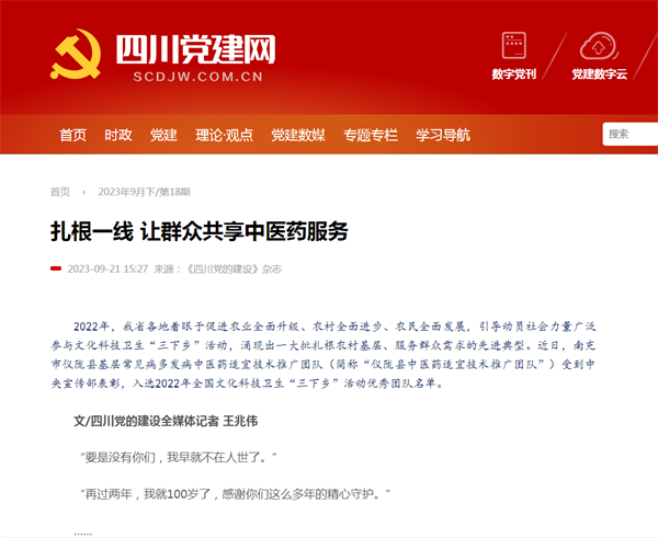 2022年,我省各地着眼于促进农业全面升级、农村全面进步、农民全面发展,引导动员社会力量广泛参与文化科技卫生“三下乡”活动,涌现出一大批扎根农村基层、服务群众需求的先进典型。近日,南充市仪陇县基层常见病多发病中医药适宜技术推广团队(简称“仪陇县中医药适宜技术推广团... 【详情】