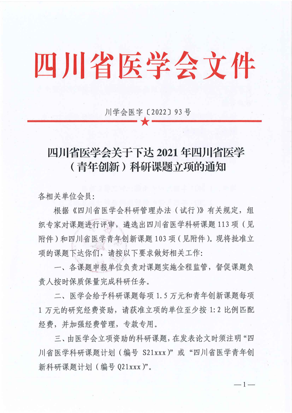 近日,四川省医学会公布了四川省医学会关于下达2021年四川省医学(青年创新)科研课题立项的通知,我院外二病区主任王朝俊副主任医师、硕士研究生漆雯主持的《基于证素辨证体系影响1型、2型糖尿病视网膜病变患者危险因素分析》科研项目,前期经过长时间的资料收集、文献查阅、标书撰写等一系列复杂的准备工作,在接受形式审查、网上盲评和专家评审后,最终成功立项!