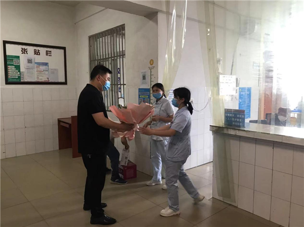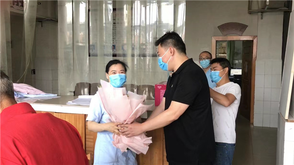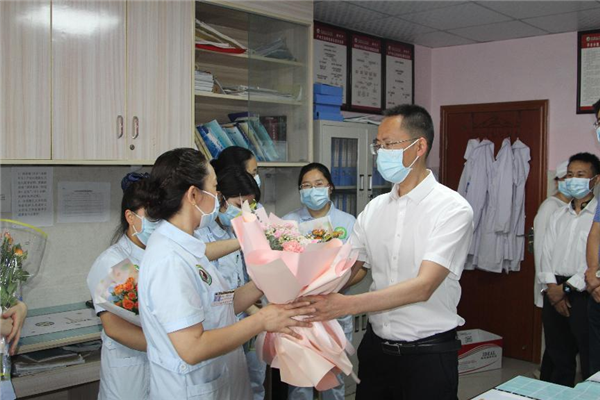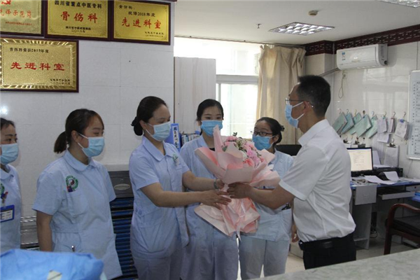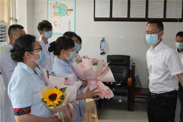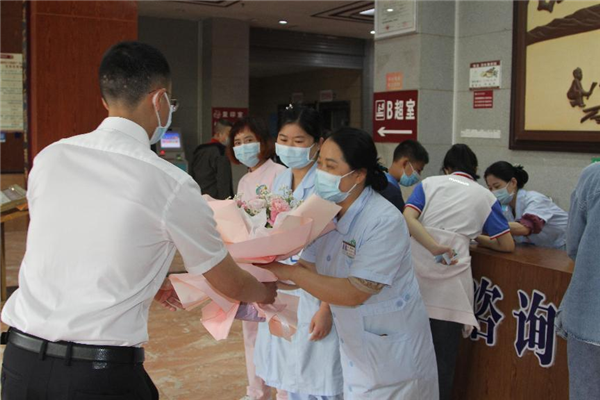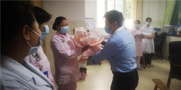 “今天是护士节,大家辛苦了!”“祝福大家节日快乐、家庭幸福!”……院领导送出一束一束鲜花、一句又一句真诚的问候,让全体护理人员倍感温馨和暖心。