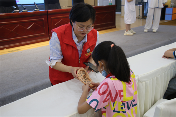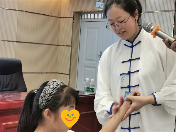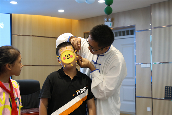 中医眼科易鲜中医师、内一病区杨国才护士长针对护眼保健知识给同学们进行了讲解,对眼部周围的穴位和功效以及耳穴埋豆的功能进行介绍,同学们现场体验了耳穴埋豆。