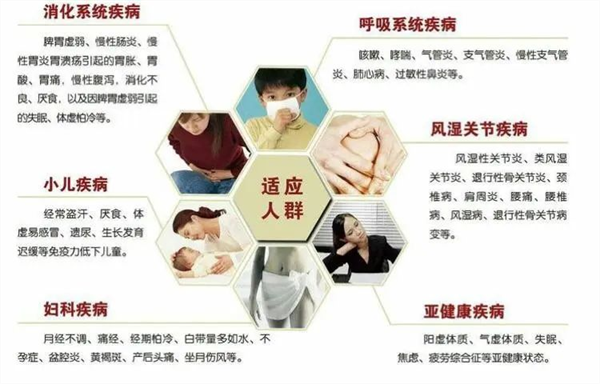 6、小儿体质疾病:如尿床、食欲不振、拉肚子、个子矮小、身体抵抗力差、哮喘、慢性支气管炎、过敏性鼻炎等。