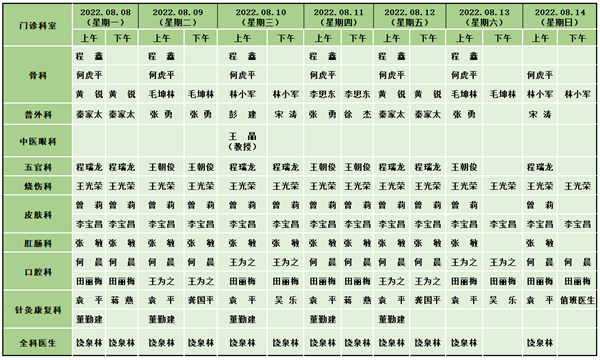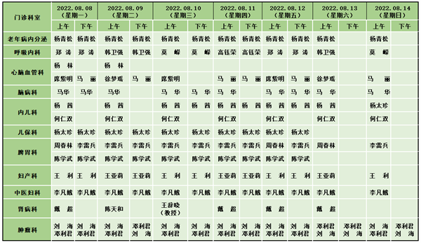 仪陇县中医医院新政院区门诊医生排班表(8月8日-8月14日)
