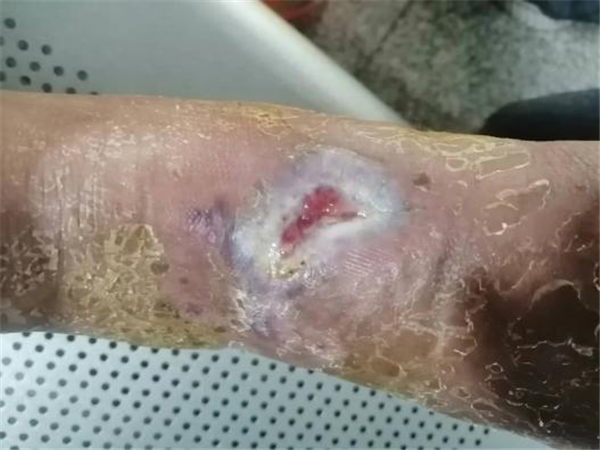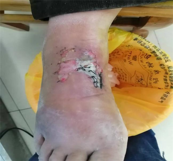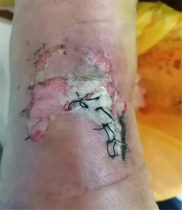 治疗经过:到我院烧伤科后,医生看见足背裂口周围皮肤发白,周围肌肉全层坏死,还挤出大量脓液。王医生跟科室商量后,立即给予剔除坏死肌腱和骨膜。并告知患者可行清创负压吸引术后期皮瓣转移治疗修复创面,患者及其家属担心手术损伤疼痛及费用高昂,选择保守换药治疗。