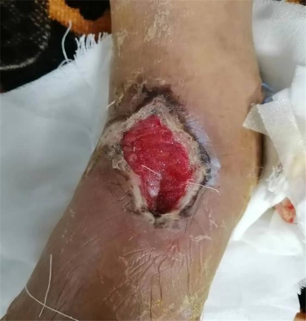 前情回顾:老人因为摔伤,导致右足背皮肤裂开,但是手术治疗后裂口逐渐坏死,右足至右小腿红肿,无法下地活动,为了得到进一步治疗,来我院烧伤科治疗。