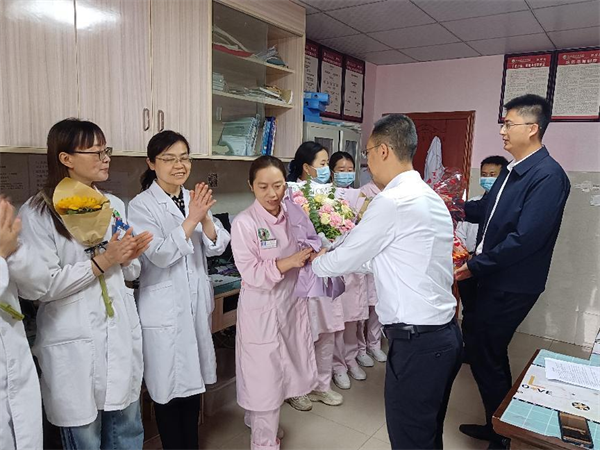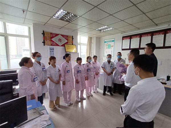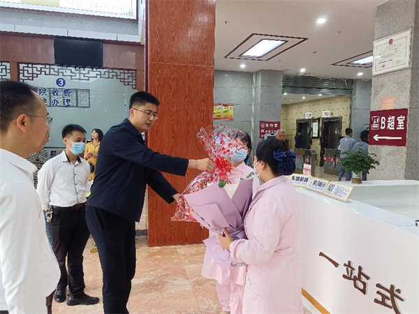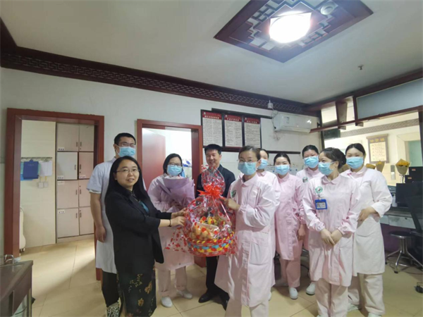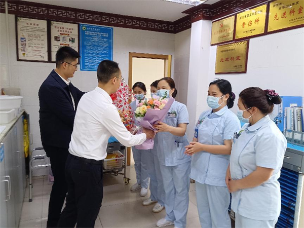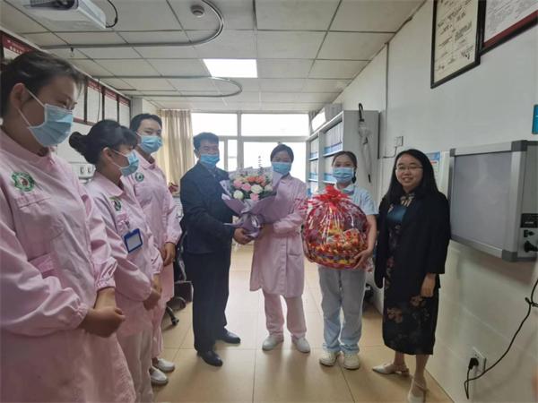 5月12日上午,医院党委书记彭建、副院长程鑫、李俊、董勤建、徐梦瑶、工会主席刘海分别对新政院区及金城院区各科室护理人员进行了慰问,并为他们送上鲜花、果篮和节日祝福。