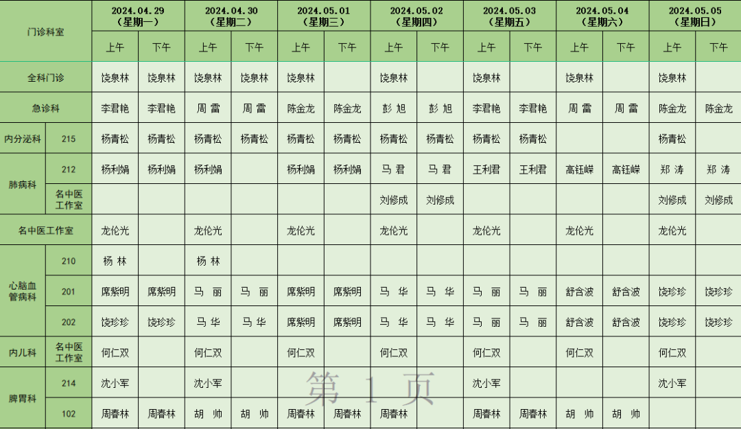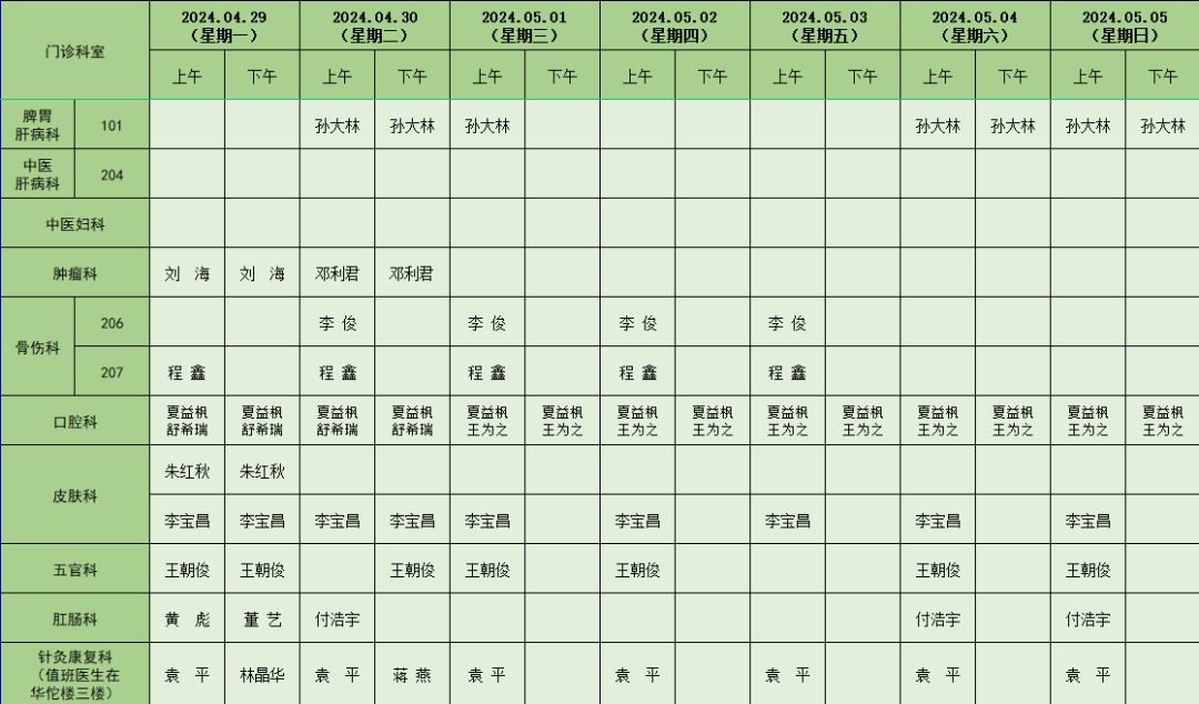 门诊医生排班表(4月29日-5月5日)